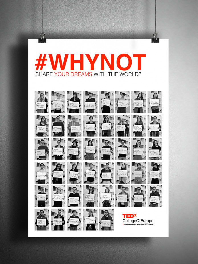 We think your #WHYNOT thoughts are equally important. This is why we invite you to share your #WHYNOT with us. Here is an easy way to contribute: print the attached form, write down your #WHYNOT and take a picture with it. Once you send it to us (info [at] tedxcollegeofeurope.eu), we will integrate it into an art exhibition at the College of Europe.